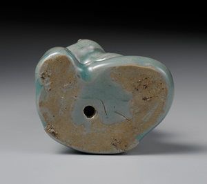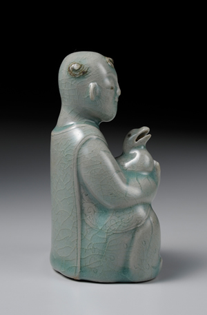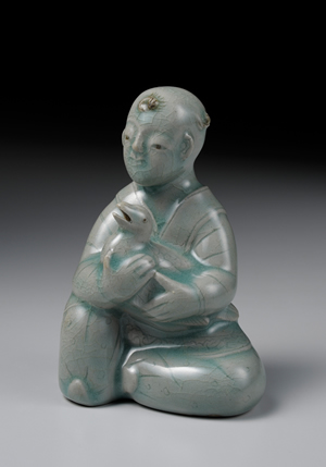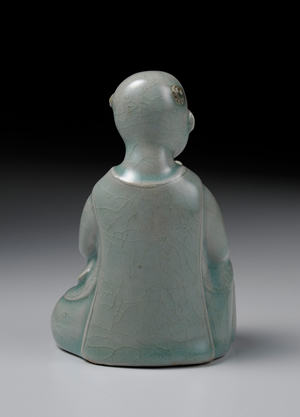 本器作風、尺寸以及紋樣表現等,與青瓷雕刻童女形硯滴(No00130)幾乎相同,極可能出自同一工匠之手。此硯滴作童子造型,臂彎中環抱一鳥,注水口位於器底,出水口則在鳥兒口部。眼瞳與前髮等部位加飾褐彩,細節部分施加細緻的線雕紋樣。器型雖小,卻是釉色優美、散發沈靜氛圍之佳作。