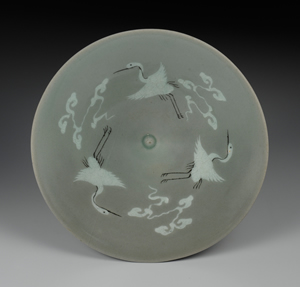 碗口處略為外翻,只在碗內壁裝飾紋樣。三鶴飛鳥翱翔於靈芝雲中。裝飾技法以白象嵌為主,僅在鶴嘴、鶴頸與腳部,施飾黑象嵌。全器無開片,深灰青綠的釉色與象嵌裝飾十分協調,作風充滿張力。器底亦施釉,僅圈足接地處周圍擦去釉藥,留有5處由耐火土留下的小支燒痕。