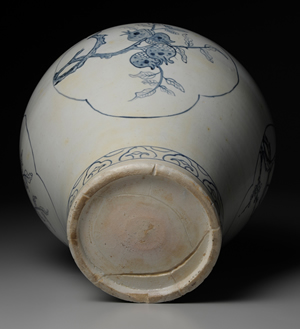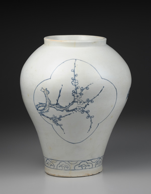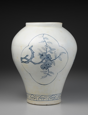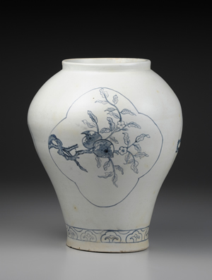 本罐直口、短頸,器身線條呈S形曲線。器身中央設3處四瓣海棠式開光,其中描繪桃花、梅花與石榴等3種主要紋樣。枝幹皆由左向右橫向伸展,巧妙配置於開光的範圍中。青花紋樣發色濃重,青中帶黑;白瓷呈色乳白,不帶一絲青味。紋樣裝飾,留有大量餘白,充分顯示18世紀前半的風格特徵。