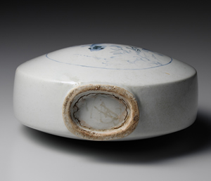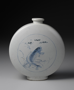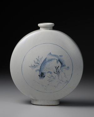 日人與朝鮮青花的接觸時間,可以溯自16世紀左右。本作經加賀前田家族收藏傳世,收納箱上書有題名「高麗物染付 太鼓成得利」。之所以稱為「太鼓成得利(德利)」,大概是由於器身兩面膨脹鼓張猶如太鼓而得名。此作在日本是傳世多年的珍貴器物,器面兩面裝飾鯉魚紋飾,風格高雅,應是出自宮廷畫師之手。