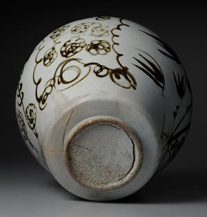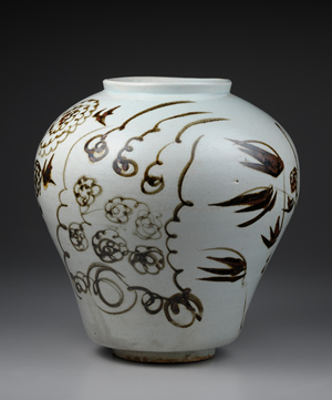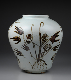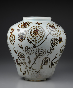 器身滿飾生氣勃勃的花朵,在春意的召喚下,吐蕊綻放,花朵迸放的同時,似乎還發出砰砰的聲響。原收藏者安宅英一先生就曾將此器稱為「砰砰的大麗菊罐」。17世紀時,中國青花顏料(鈷料)的進口曾一度中斷,也讓使用含鐵顏料彩繪的鐵砂(鐵繪)技法因此盛行。鐵繪的奔放筆調在本作得到充分發揮。器型與紋樣間協調平衡,安定感油然而生。本器釉色潔白,於鐵砂罐中甚是珍稀,在白皙肌理的襯托下,花草的姿態顯得更加鮮明可愛。