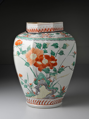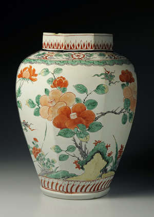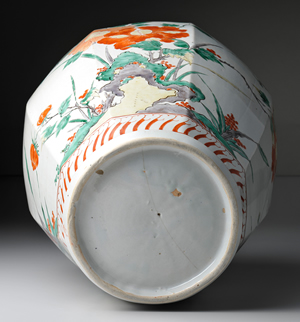 器身兩側分別描繪牡丹花與椿花,均搭配太湖石圖樣。紋樣不受八面造型限制,橫跨全器,風格恢宏大氣。充滿感染力的紋樣,華美而動人,完美彌補口部變形歪斜的缺陷。紋樣及造型與延寶年間(1673-1681)柿右衛門樣式的五彩瓷器之間存有共通之處,然胎土精純程度明顯不如後者。此器物曾輸出海外,據傳於歐洲流傳相當時間。