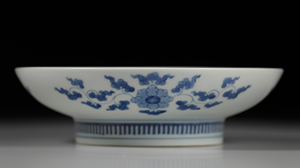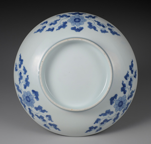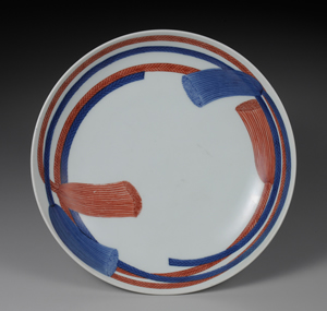 鍋島燒乃是鍋島藩出於進獻將軍之目的,於其藩窯所特別燒造之製品。符合進獻瓷器(日稱:獻上瓷器)的精巧作風以及格式化的表現方式,為鍋島燒之特色。純白肌里上,以青花及釉上紅彩,描繪兩兩一組的兩對組紐文,紋樣雖然簡略,構圖設計卻甚是創新。組紐的垂穗由緻密的點線構成,充分展露鍋島藩窯陶工的高超技術。此器器型為「木杯形」的七寸盤皿,器外壁3處以青花裝飾纏枝花紋樣。