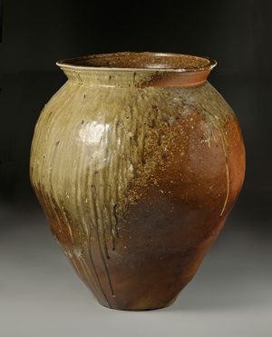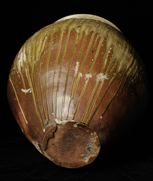 越前窯為日本中世燒製無釉高溫陶器的主要生產地之一。此作於越前燒所生產的甕類製品中,屬於體積較大的一類。俐落的器口向外開敞,器肩下垂,器腹膨鼓富有張力,腹部至器足處逐漸收斂。恢宏大氣造型之外,被形容為「雪崩」狀的自然釉佔據器表泰半面積,釉層下垂流淌,其恣意不羈的面貌成為全器引人注目之處。此器當可說是越前大甕的佳作之一。甕背面之器肩處,可見以篦狀工具刻畫的窯印記號。